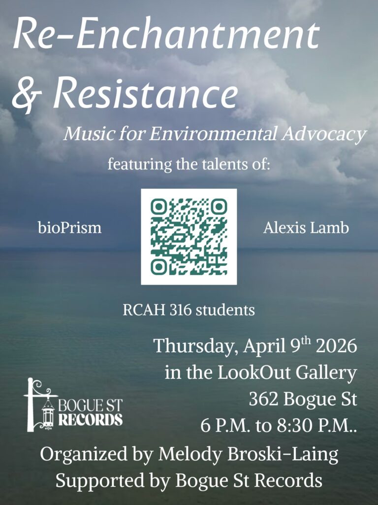 The Re-Enchantment and Resistance Music Festival features music and sound art exploring the complicated relationships between humans and the environments we exist in. This event will feature two Michigan-based guest artist performances and stations to listen to field recordings curated by RCAH 316 Sound Art students. We will conclude the event with a letter-writing activity to advocate for environmental justice in Michigan—a collective act of climate advocacy, offering participants the opportunity to write letters in support of environmental policy and action. Refreshments will be provided.